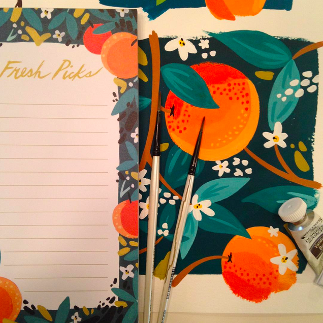 i began by selling prints of my actual large-scale paintings on etsy and at the renegade craft festivals. producing my fine art into prints led me to pairing my paintings on other paper goods such as greeting cards, notepads and so on.