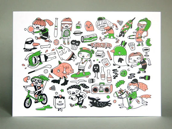 after school i worked in a photographic laboratory in wiesbaden, germany for a few years and then studied graphic design. i still loved drawing, but was not confident enough to focus on illustration. instead i took part in all kinds of classes, from photography to typography. it was interesting and important, but i still regret a bit, that i didn't put much emphasis on illustration. after university, i went to japan and worked as a german teacher and later at a printing company, always drawing and making my own zines in my free time.